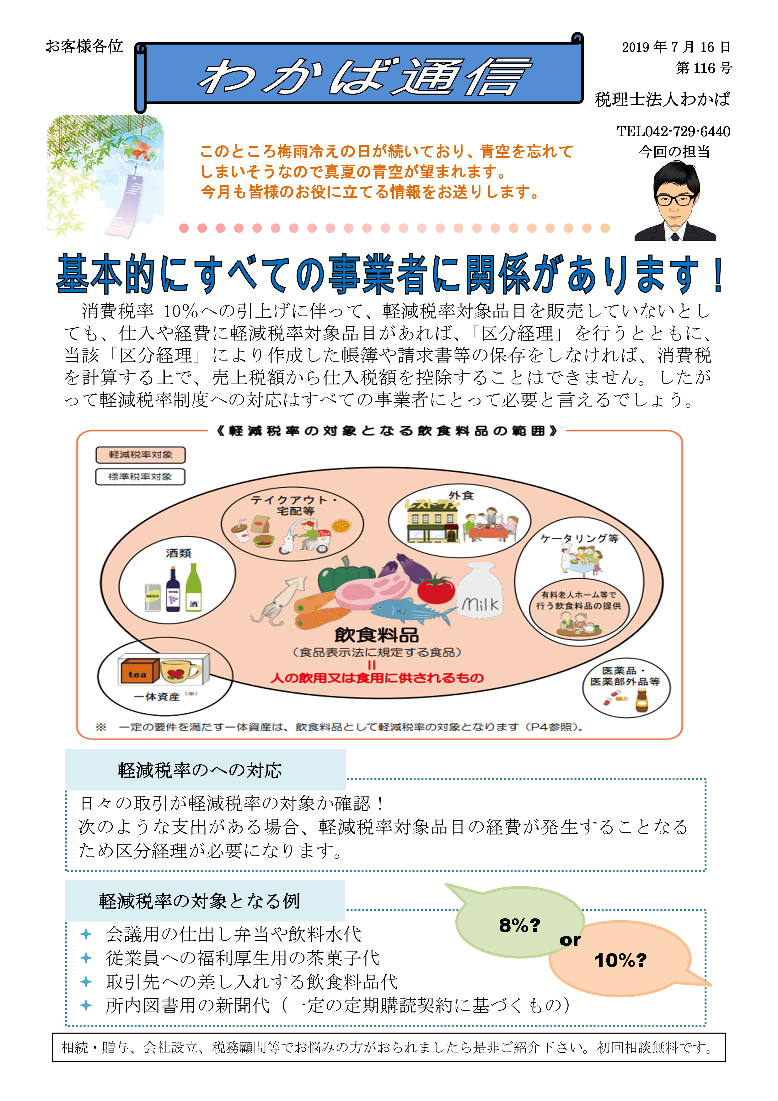 わかば通信 2019.7月号わかば通信 2019.7月号こんにちは、税理士法人わかばです!梅雨明けはまだでしょうか?梅雨寒の日々が続いて、夏が待ち遠しいです。何より洗濯物が乾きません!さて、わかば通信 2019.7月号を掲載いたします。『軽減税率制度への対応は、基本的にすべての事業者に関係があります!』についてお伝えしております。ご興味をお持ち頂けた際にはぜひ画像をクリックしてみてください!